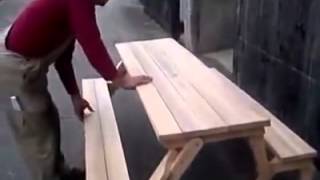 Meja Kursi yang di rangkai jadi satu tapi bisa di lipat jadi kursi panjang saja. Ide yang kreatif buat tukang kayu.